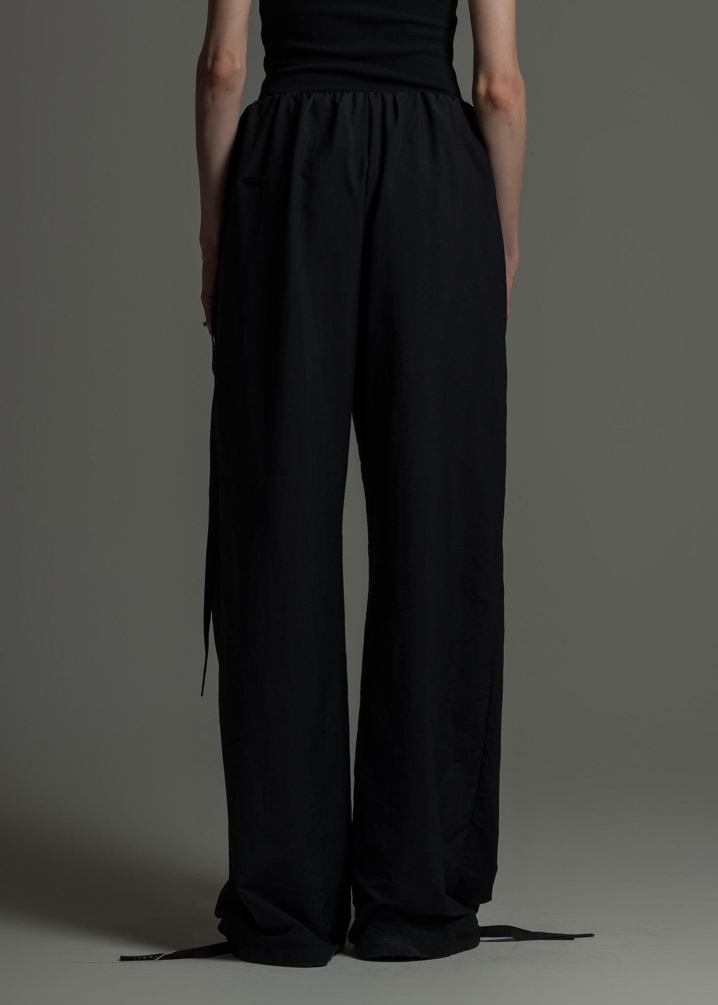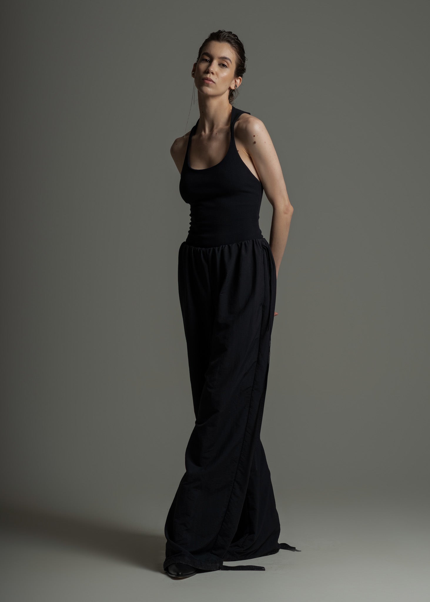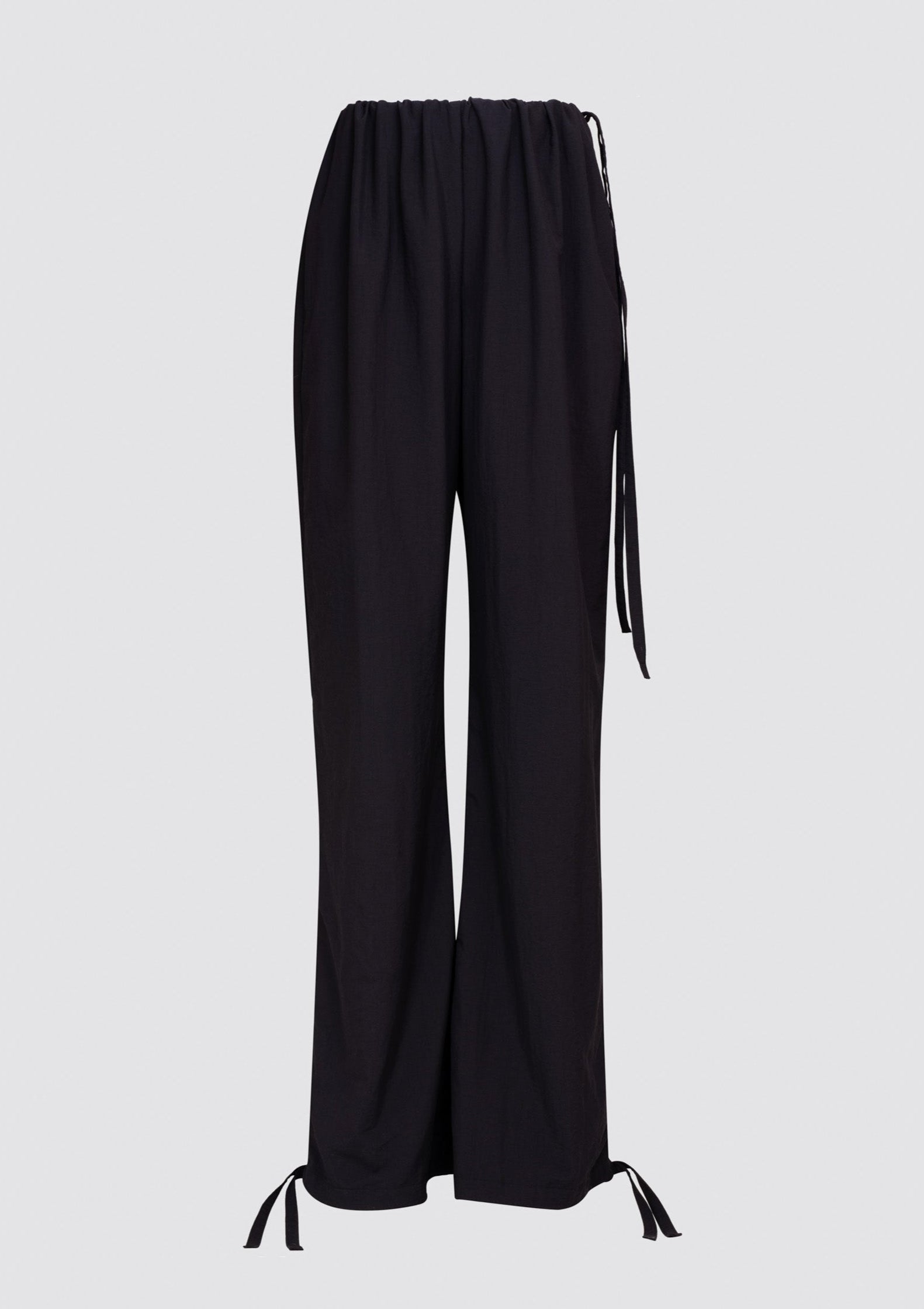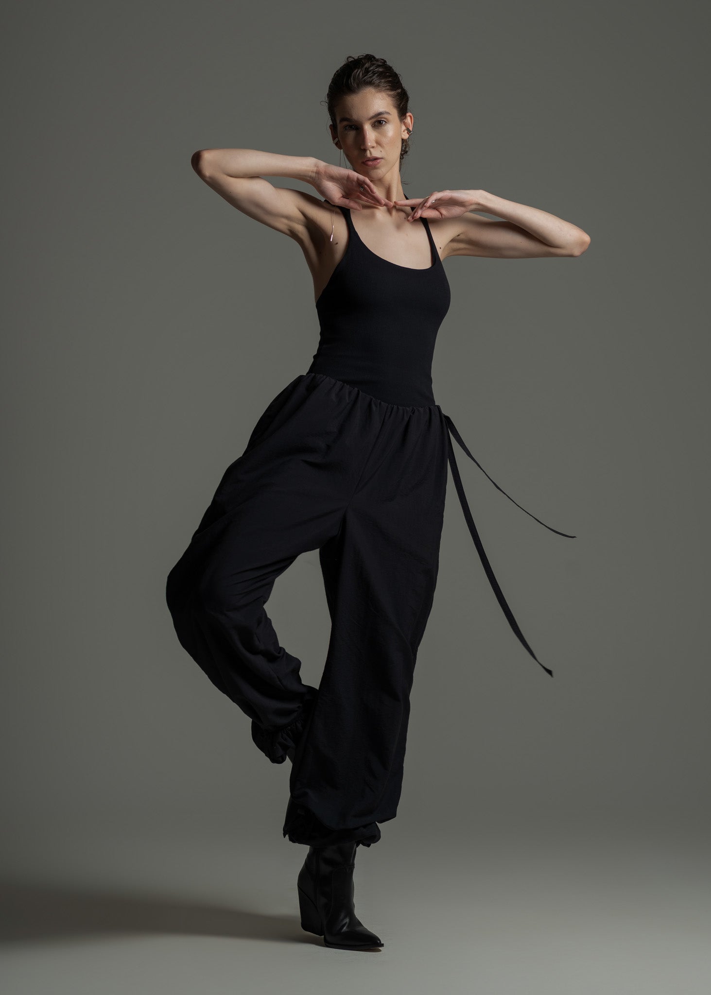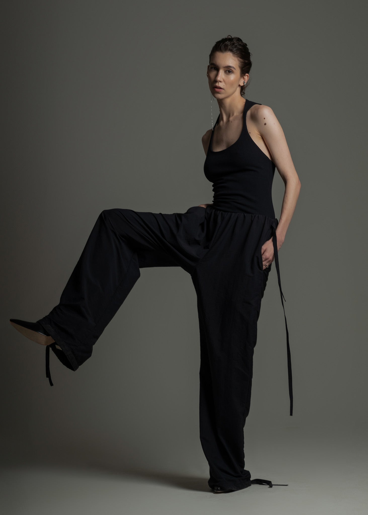 A Calça Roll se propõe a ser uma peça-chave na composição de um guarda-roupa prático e inteligente. Confeccionada em tecido tecnológico biodegradável, de silhueta ampla e super alongada, seu design traduz uma estética casual chic. O cós elástico e o gancho levemente rebaixado permitem que a peça seja usada tanto com cintura baixa quanto alta. As tiras de ajuste na cintura e na bainha, além de adicionarem movimento e charme à peça, oferecem a possibilidade de alterar sua silhueta, permitindo compor looks com sapatos altos ou baixos. O detalhe do cós, construído de forma invisível e invertida, é o elemento singular que define o design da peça. Resistente a amassados, com toque macio e secagem rápida, é perfeita para viagens.