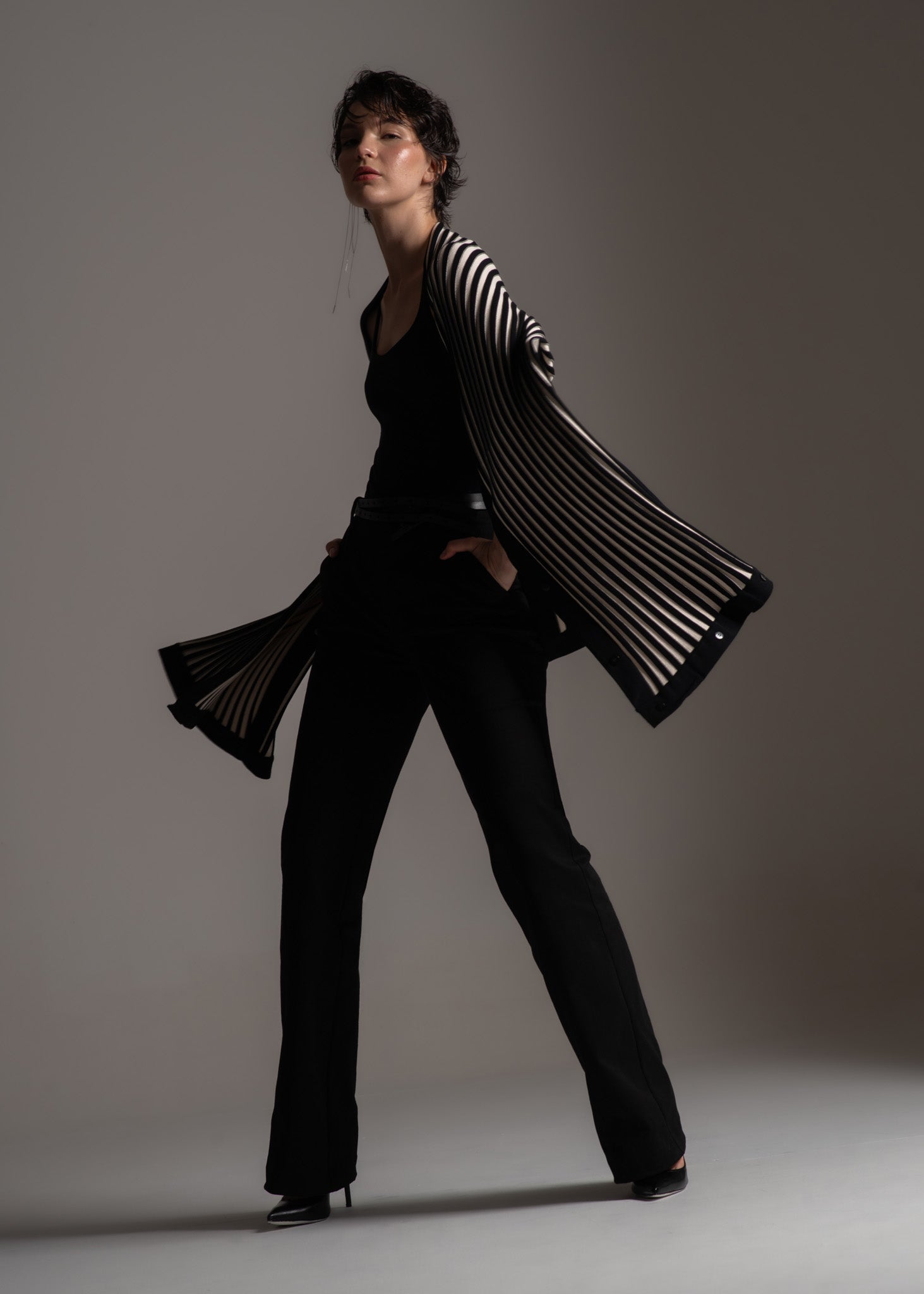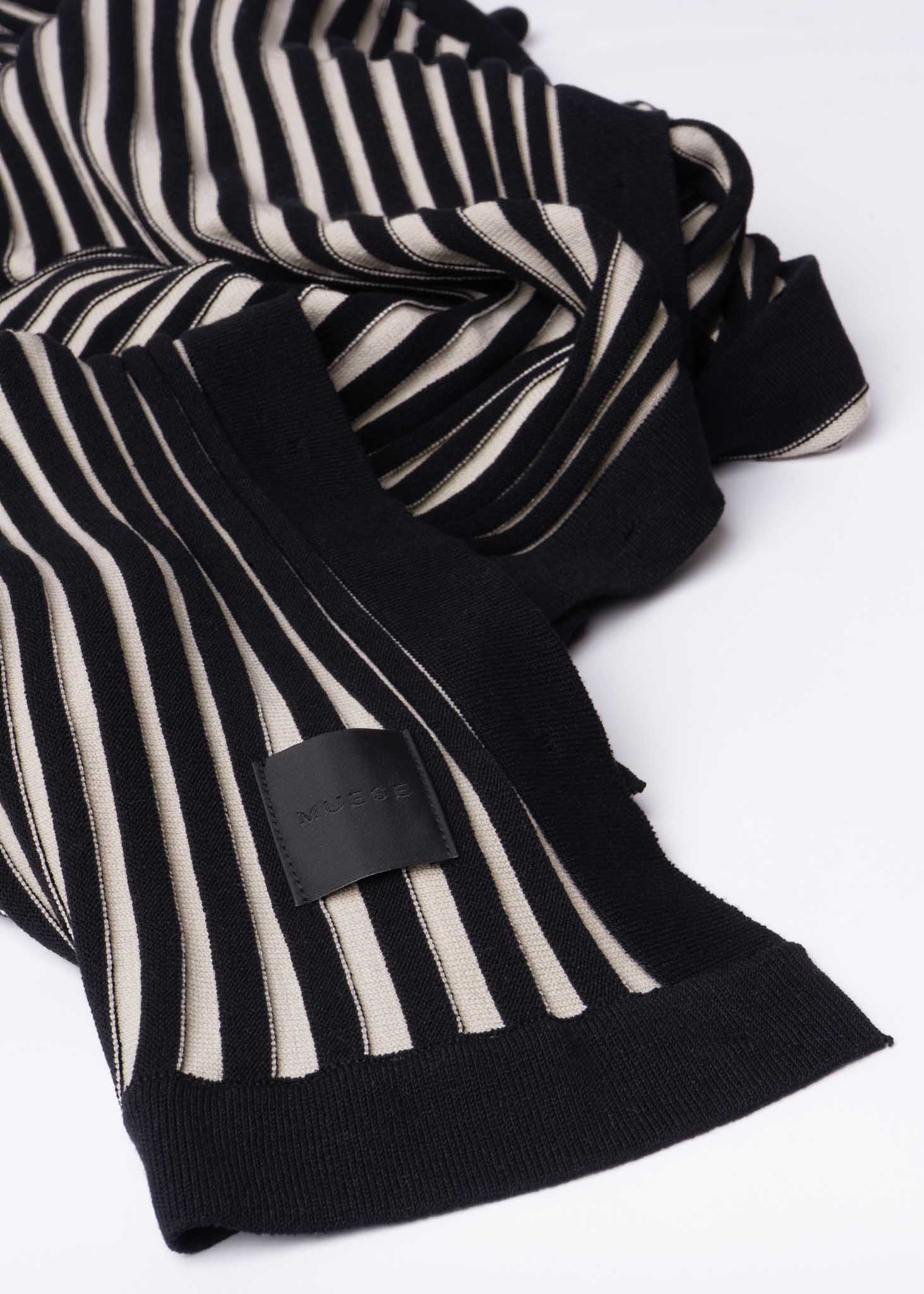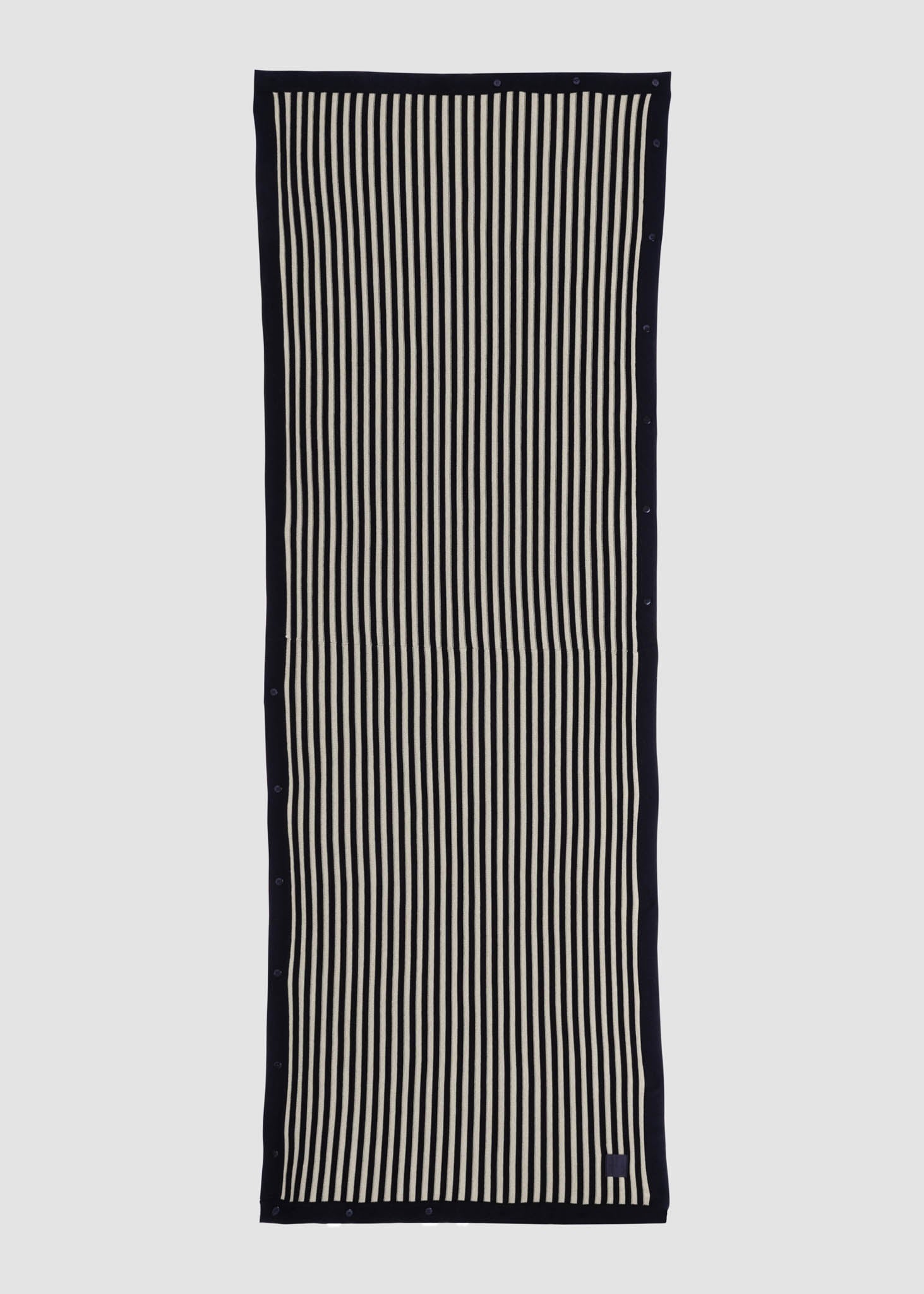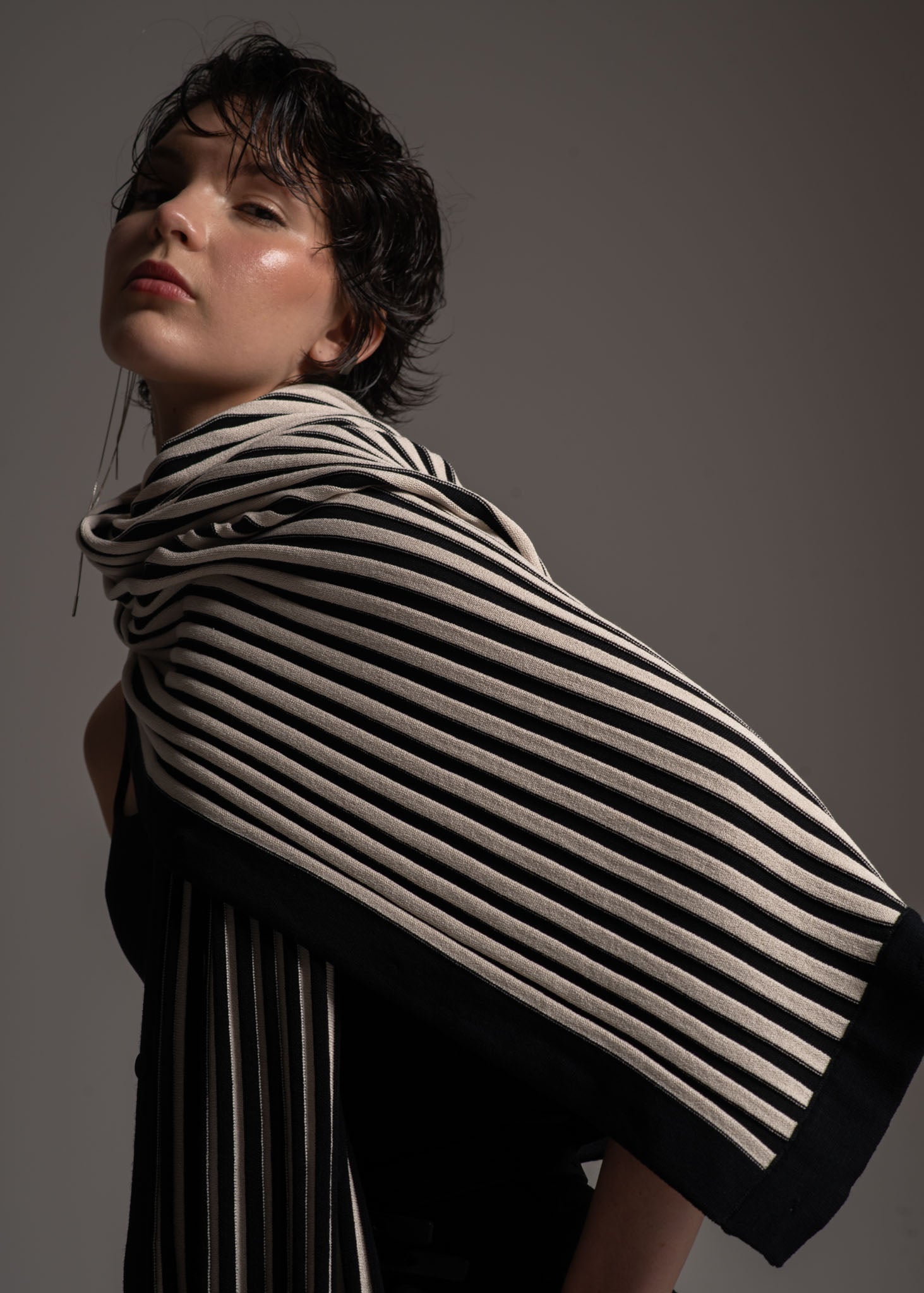 Uma peça com inúmeras possibilidades. A Echarpe Coral é confeccionada em luxuoso tricô de modal com leve brilho acetinado. As bordas com fechamento em botões permitem estilizar e drapear a peça de diferentes formas, seja como casaco, top ou moderna sobreposição. Sua trama listrada foi desenvolvida para criar um efeito visual singular. Quando em repouso, aparenta ser predominantemente preta de um lado e colorida do outro, mas ao ser aberta, movimentada ou drapeada revela de forma inesperada a cor oposta. Um diálogo entre contraste e dualidade que confere dinamismo e sofisticação ao vestir. Versátil e atemporal, é uma peça-chave no guarda-roupa que se adapta a diferentes estações e tem o poder de transformar até o look mais básico em uma produção artsy, sofisticada e de forte impacto visual.