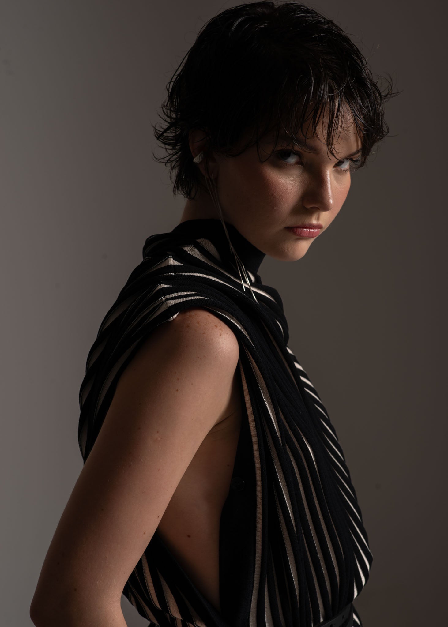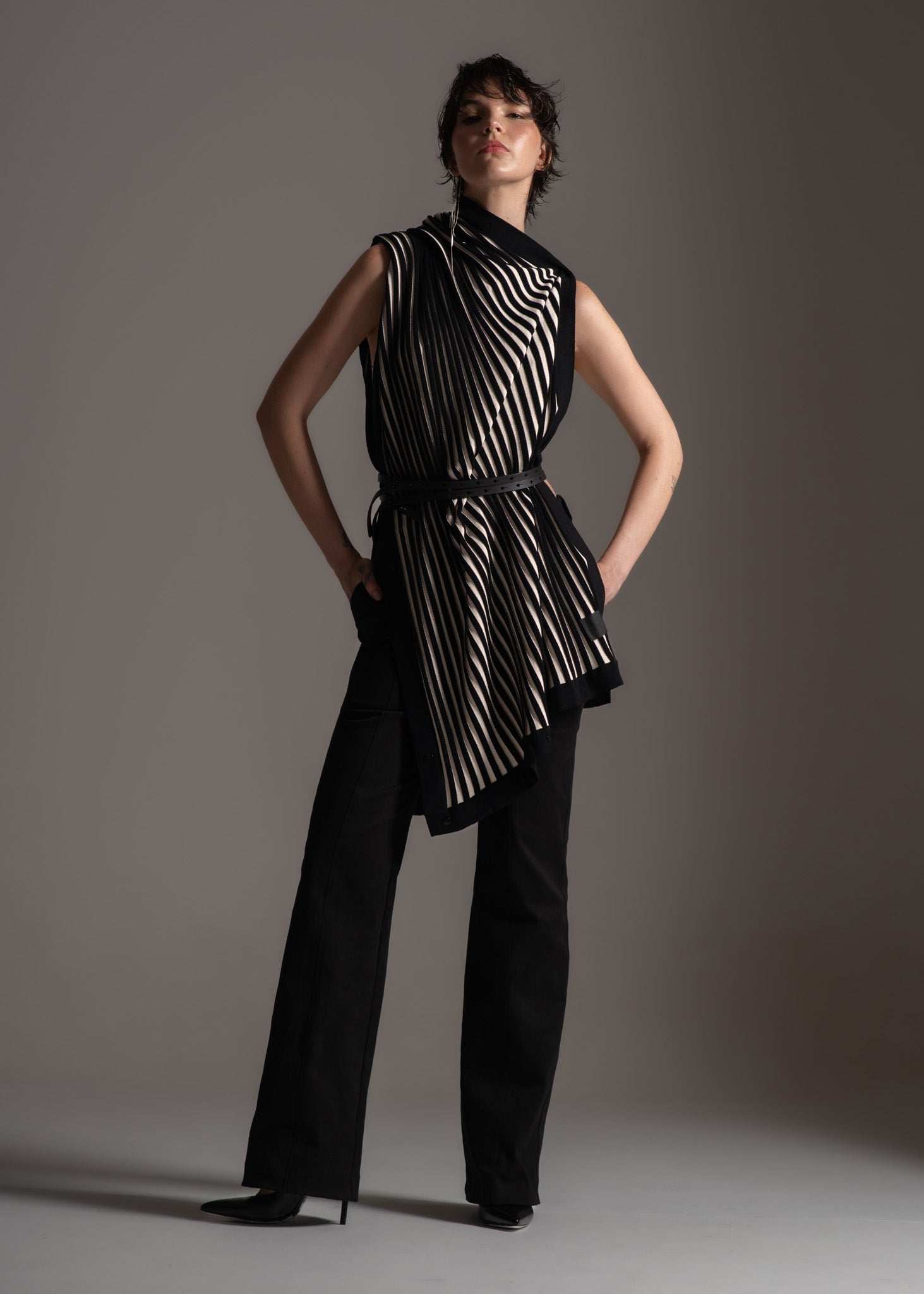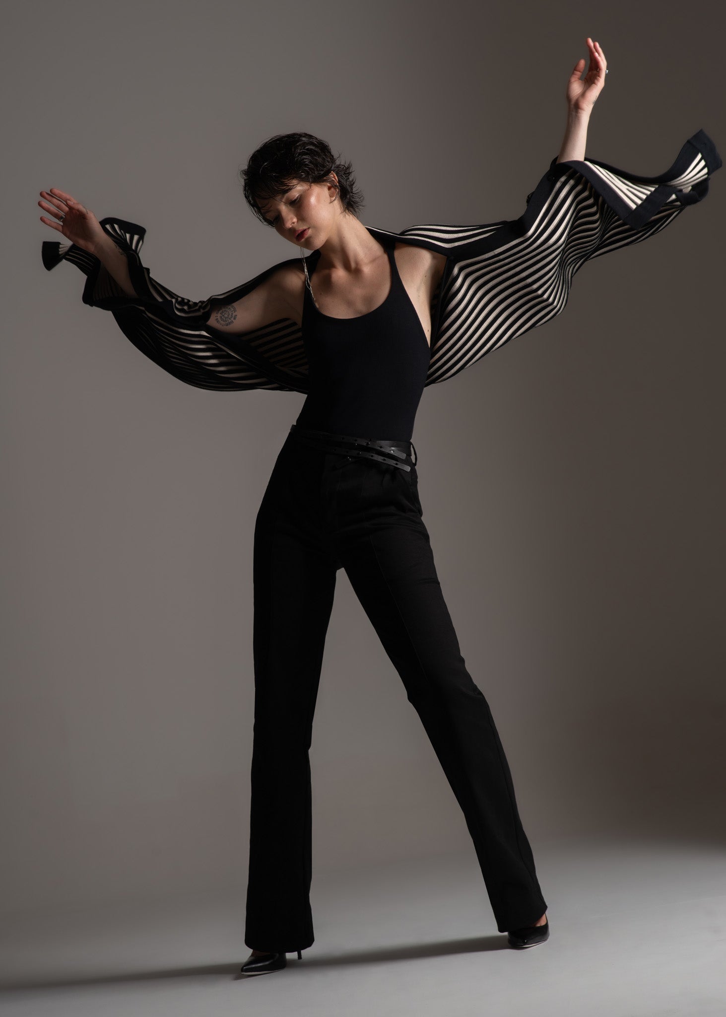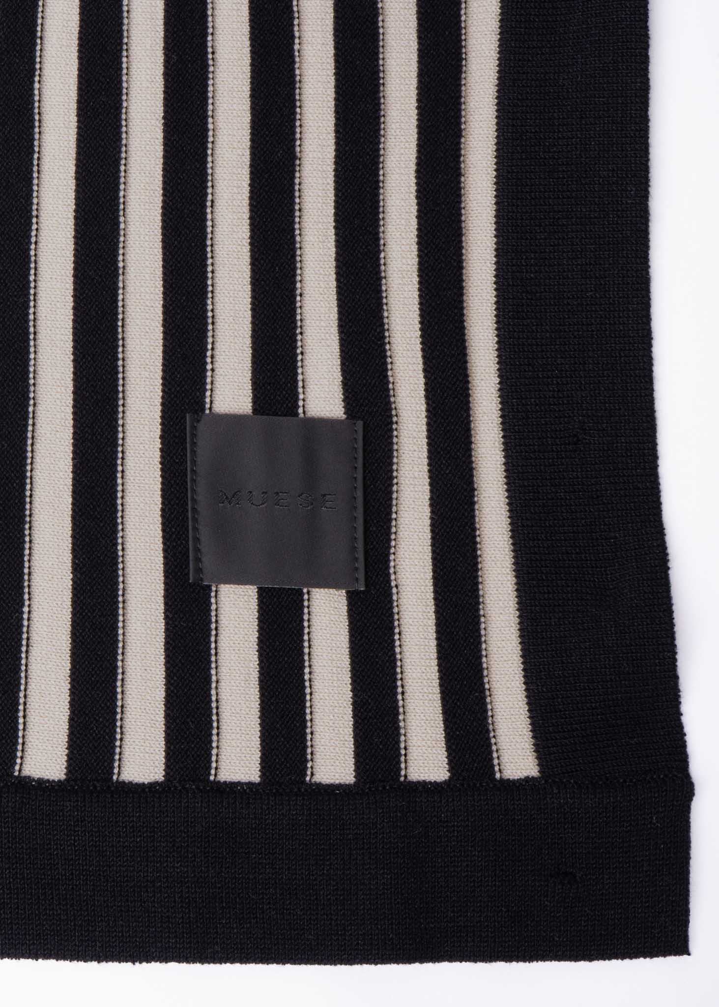 Uma peça com inúmeras possibilidades. A Echarpe Coral é confeccionada em luxuoso tricô de modal com leve brilho acetinado. As bordas com fechamento em botões permitem estilizar e drapear a peça de diferentes formas, seja como casaco, top ou moderna sobreposição. Sua trama listrada foi desenvolvida para criar um efeito visual singular. Quando em repouso, aparenta ser predominantemente preta de um lado e colorida do outro, mas ao ser aberta, movimentada ou drapeada revela de forma inesperada a cor oposta. Um diálogo entre contraste e dualidade que confere dinamismo e sofisticação ao vestir. Versátil e atemporal, é uma peça-chave no guarda-roupa que se adapta a diferentes estações e tem o poder de transformar até o look mais básico em uma produção artsy, sofisticada e de forte impacto visual.