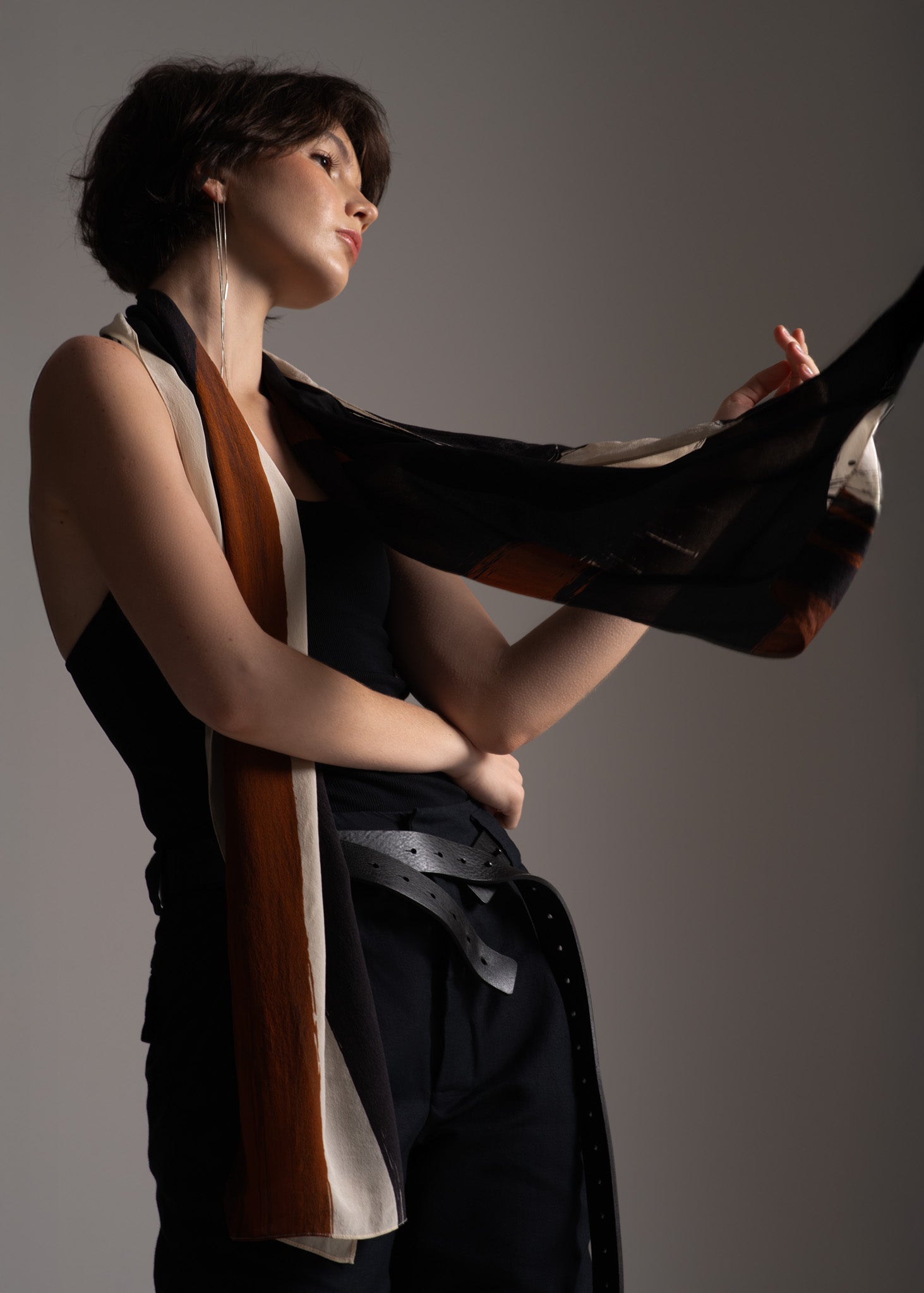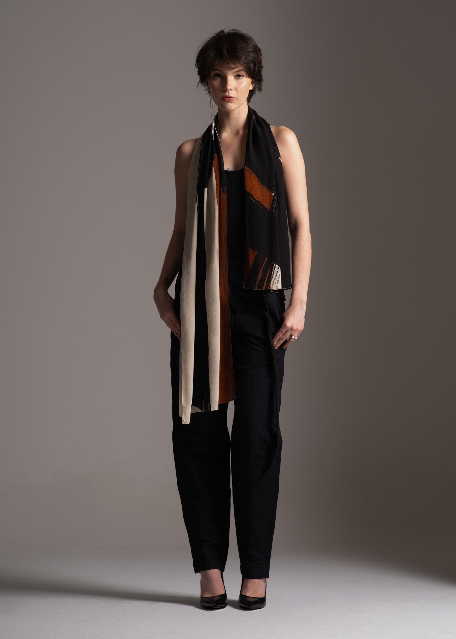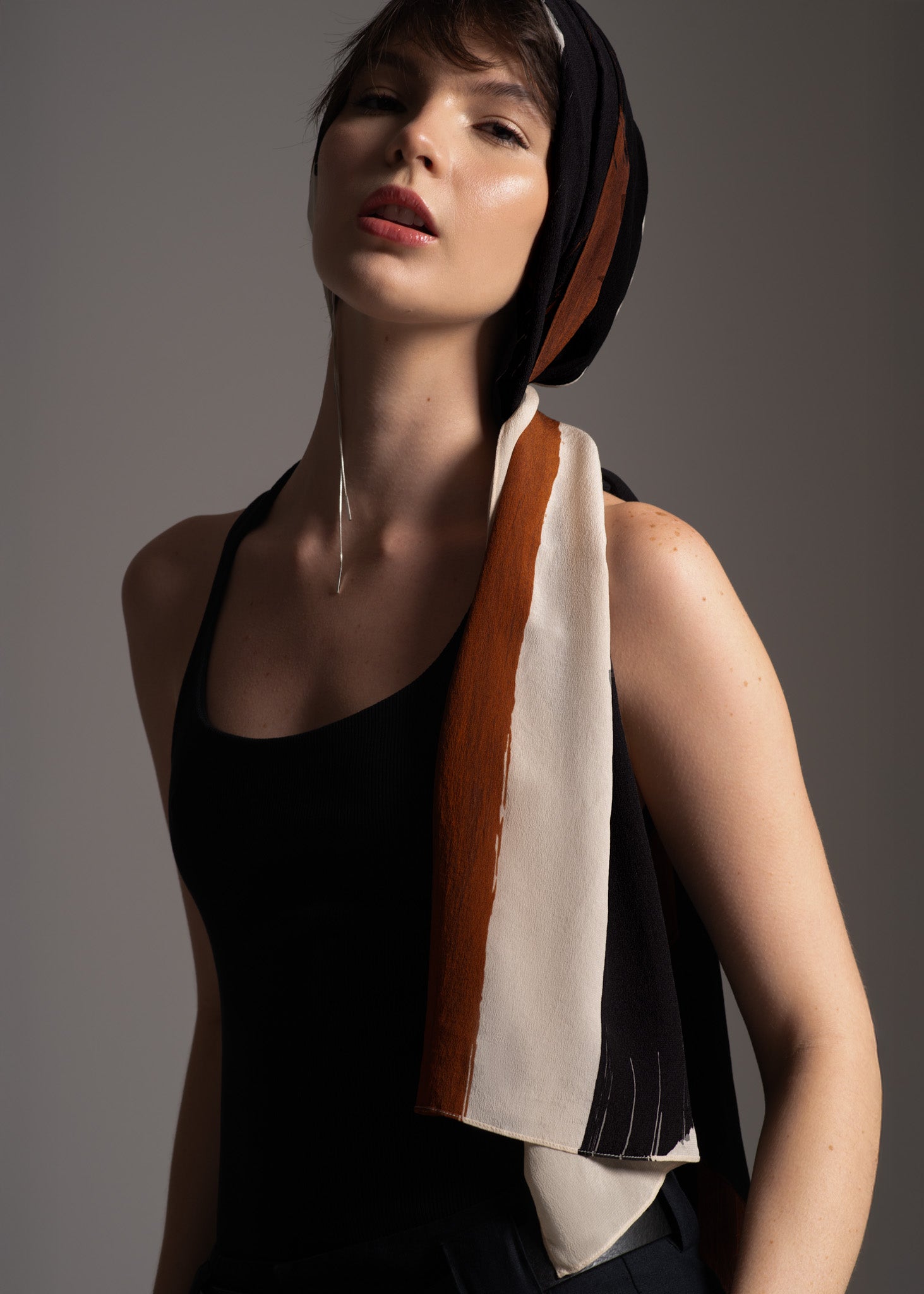 O Lenço Fall foi idealizado para complementar produções monocromáticas, adicionando dinamismo, movimento, leveza e até mesmo um toque de drama. Sua estampa digital, desenvolvida pela fundadora da marca, reflete nossa paixão pelo Expressionismo abstrato. Com forma retangular extremamente versátil, componha-o com um blazer, com uma t-shirt, como cinto, alça de bolsa ou como um top para dar um toque artístico à sua composição.
