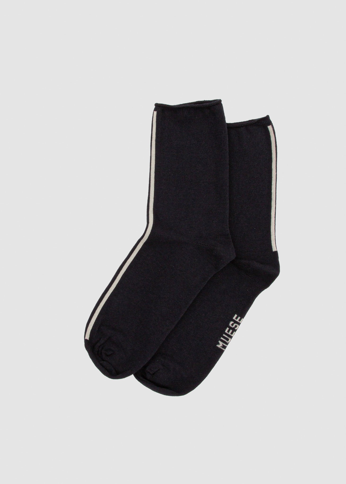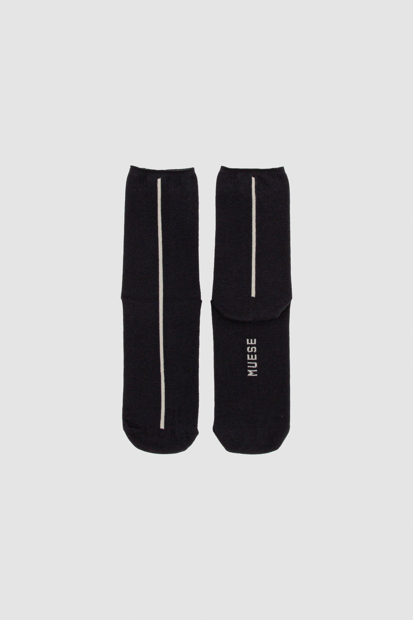 As Meias Line Muese combinam conforto e estilo. Com cano de altura média, ausência de punho e com calcanhar verdadeiro, esta meia oferece o ajuste perfeito para um dia inteiro de conforto. Destacando-se na cor preta com listras verticais em marfim, acrescenta um toque de estilo ao look. Para um detalhe exclusivo, incorporamos nossa logo na sola.